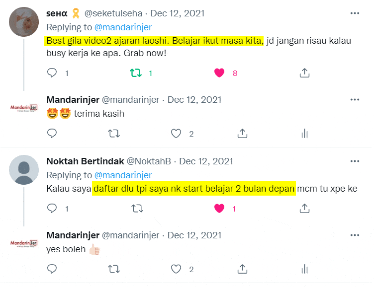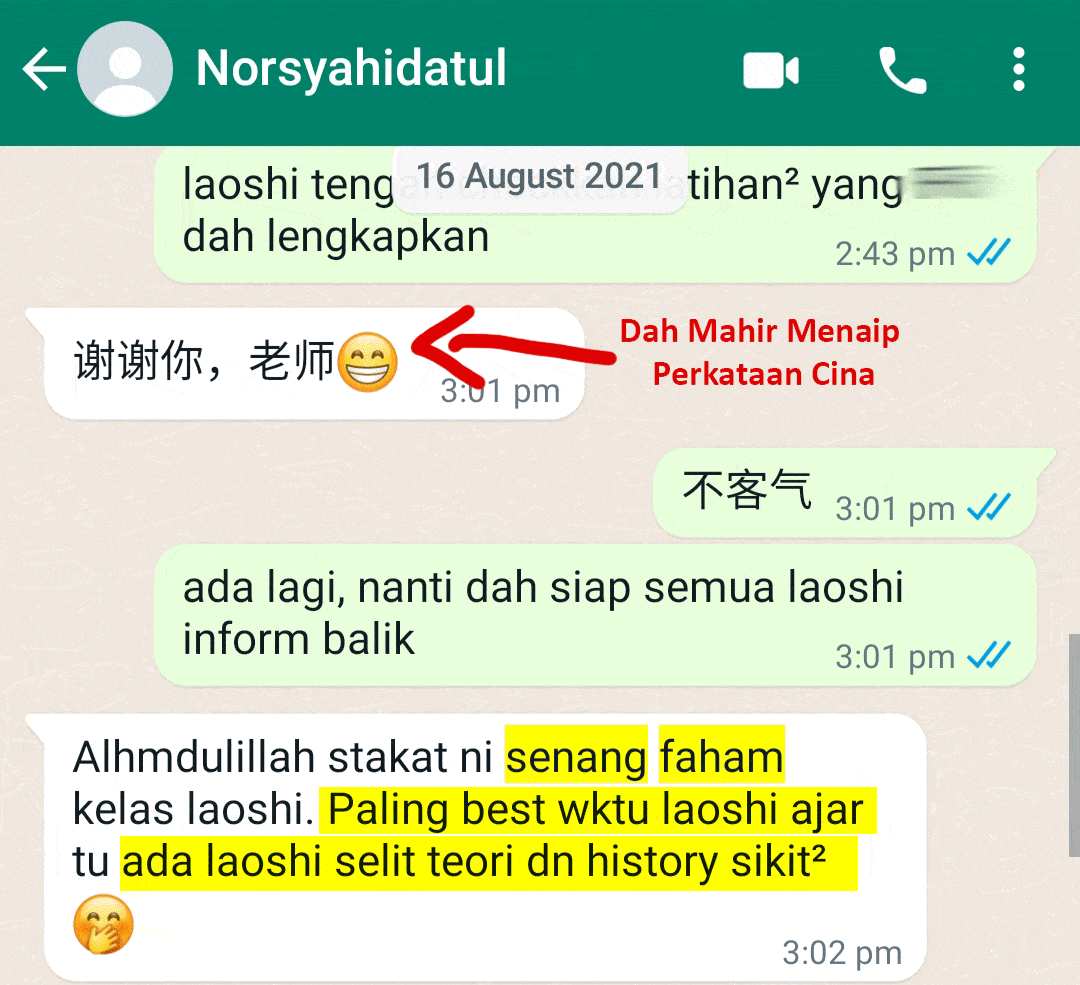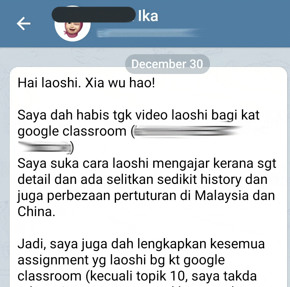 laoshi amat tekankan continuous learning - teruskan belajar, bertanya dan menjawab kuiz/latihan extra dalam telegram group